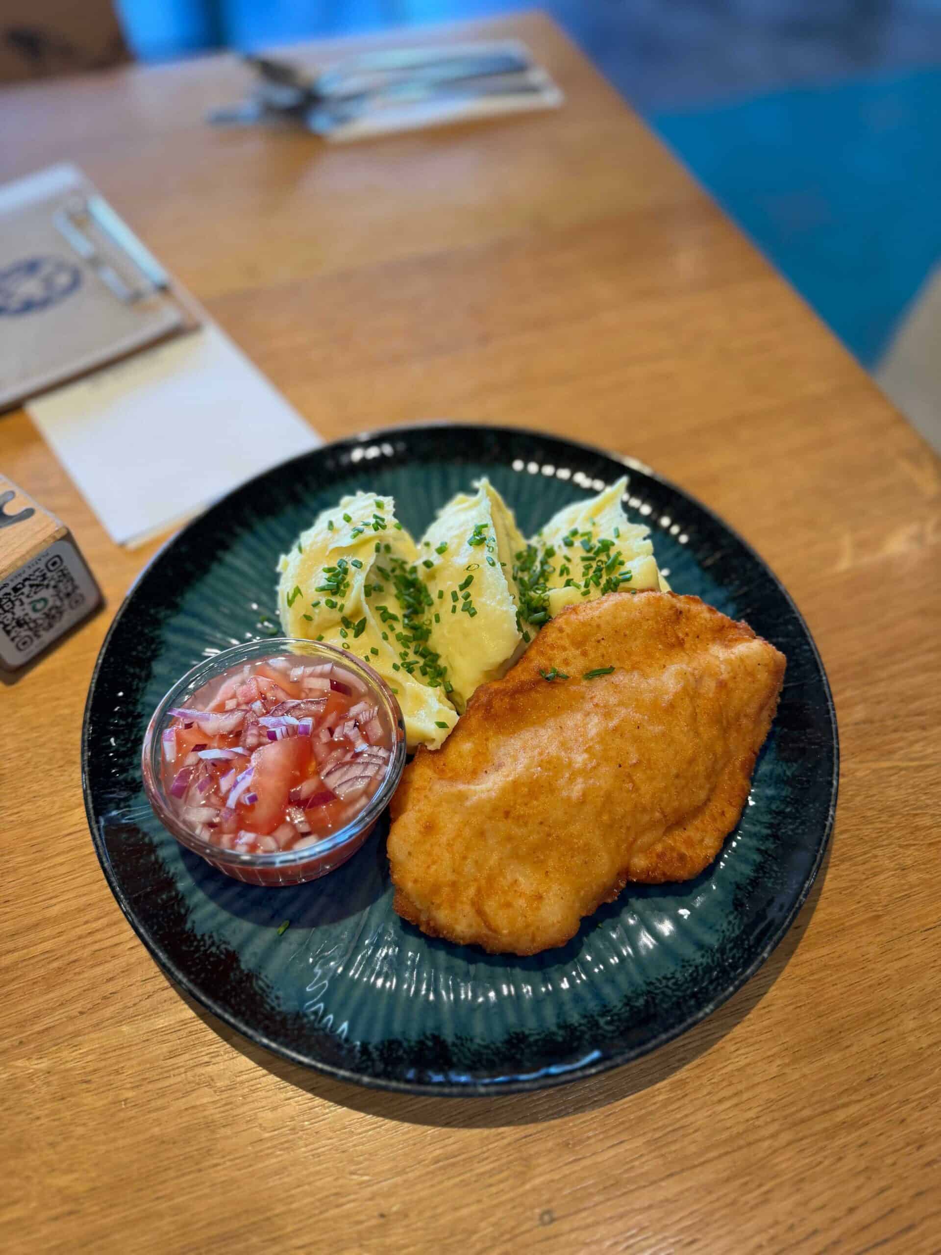 Kuřecí řízek, bramborové pyré, rajčatový salát 199,-