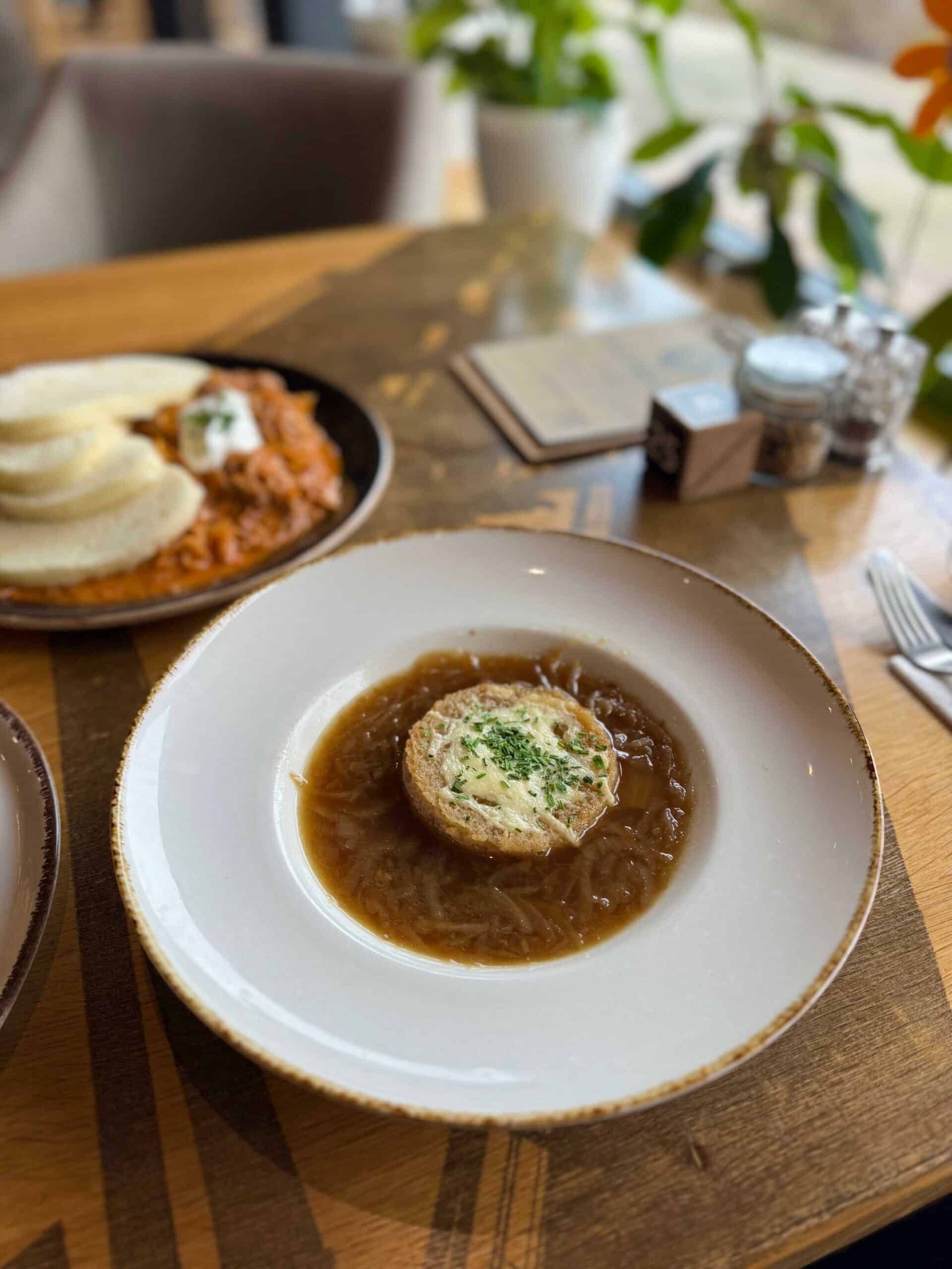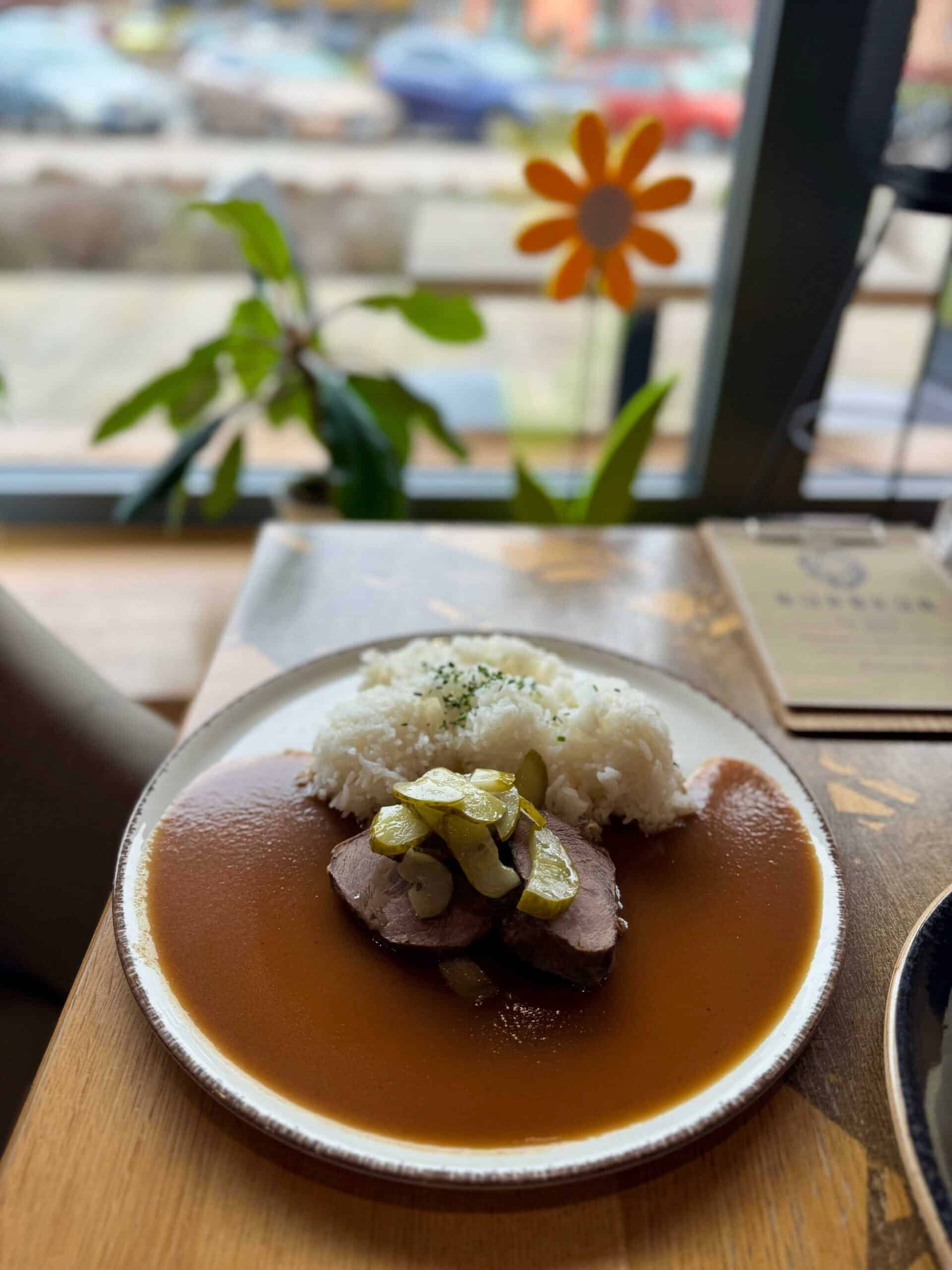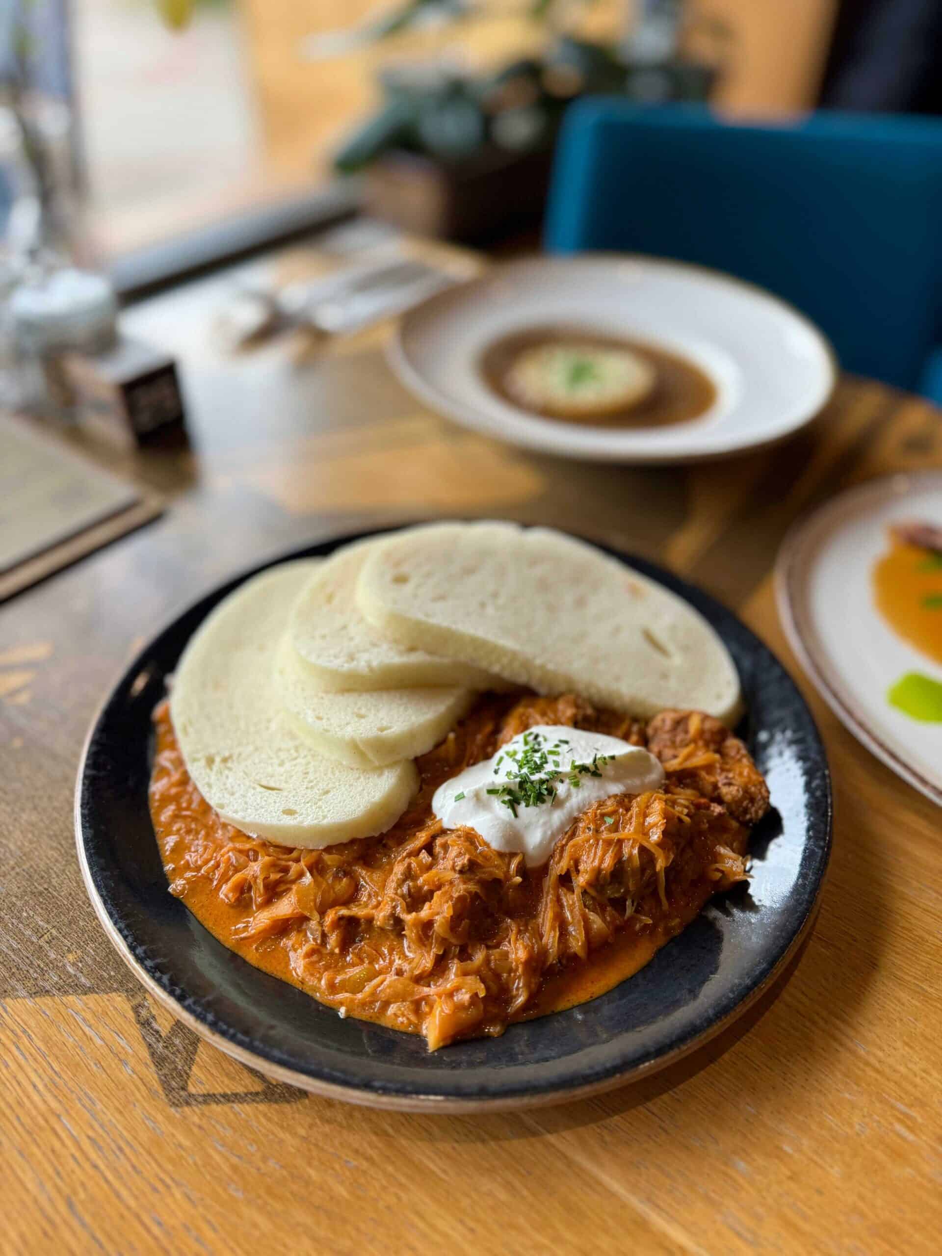 Králičí roládka, hráškové pyré, mladý hrášek, šalvej, demi – glace 329,-